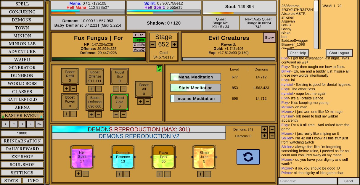Train your stats, cast spells, feed your minion, defeat monsters and bosses, raise demons, craft gems, go fishing and so much more in Wizard and Minion Idle--WAMI. This free to play, solo developed, Idle/active hybrid game has flexible pacing for long-time play-ability.