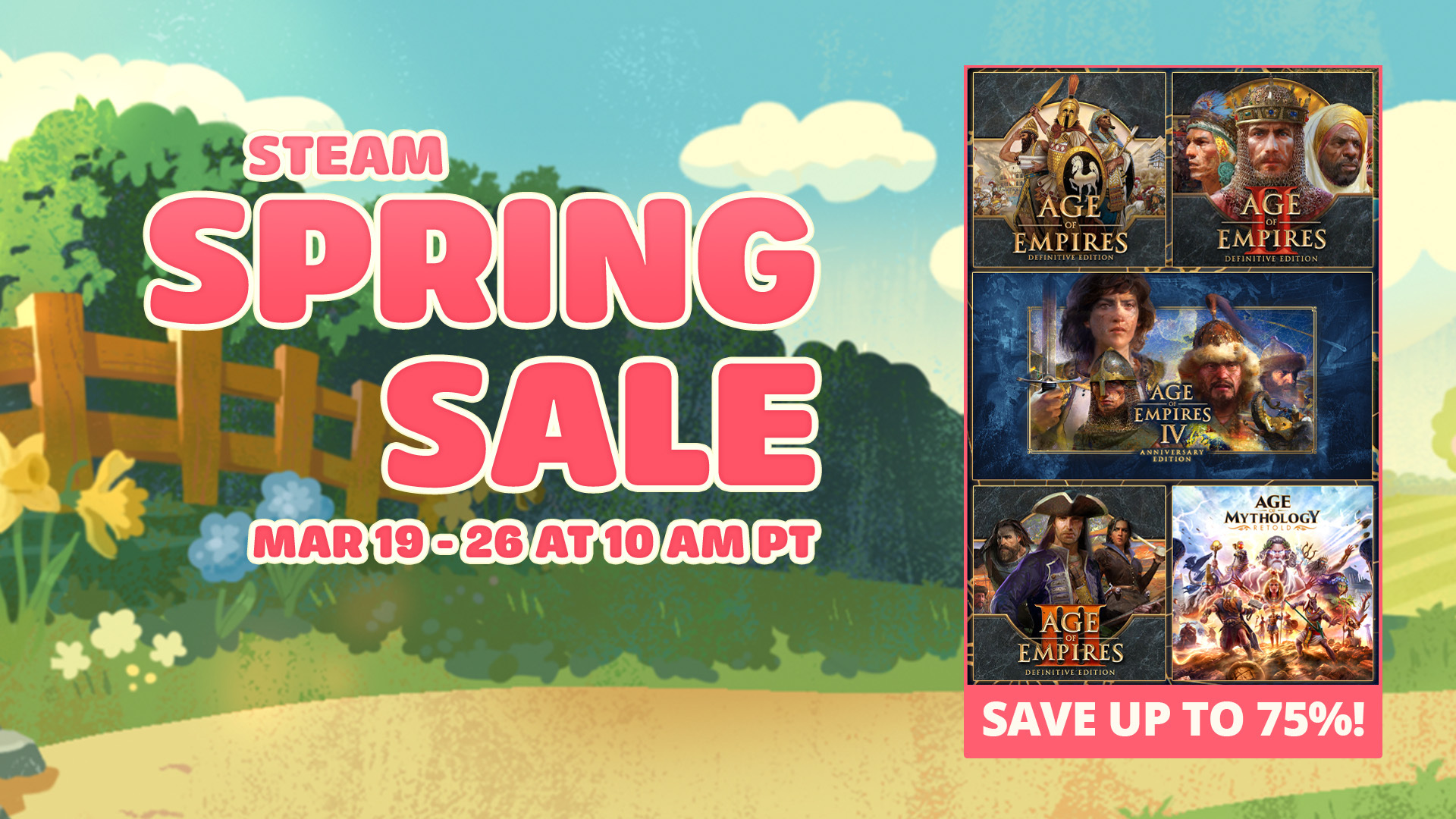 Spring is just about here and with it some discounts on all your favorite Age of Empires games! Pick up a missing DLC or two for up to 75% off! Don't wait - sale ends on March 26th!