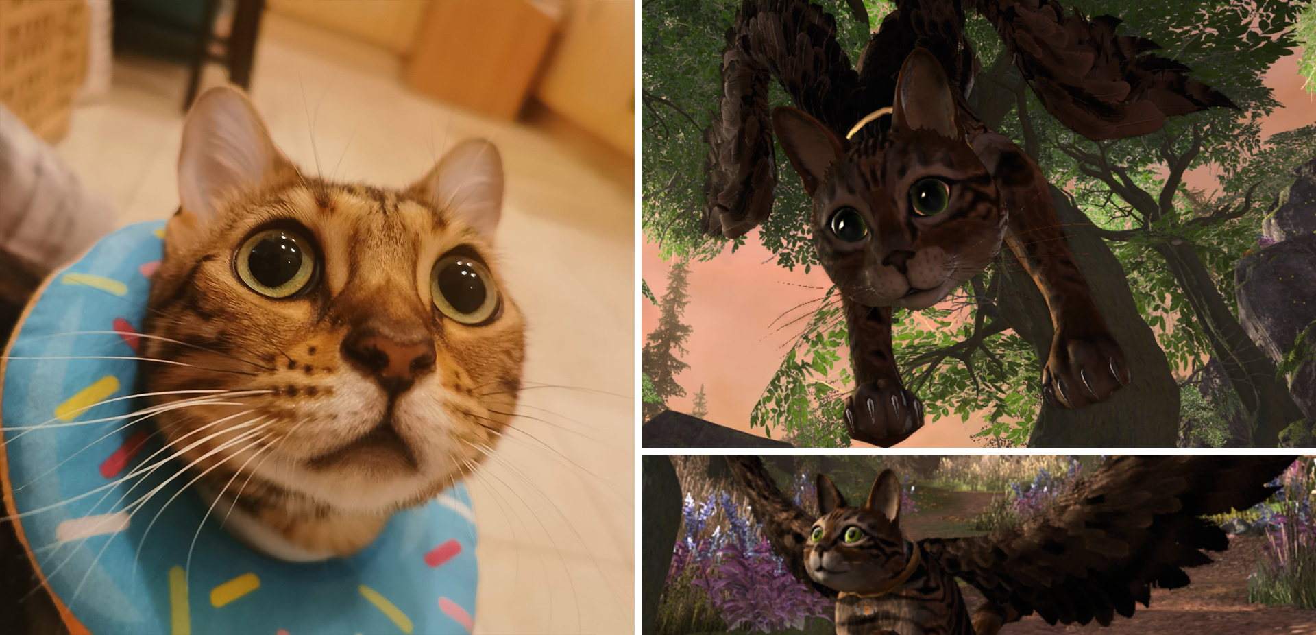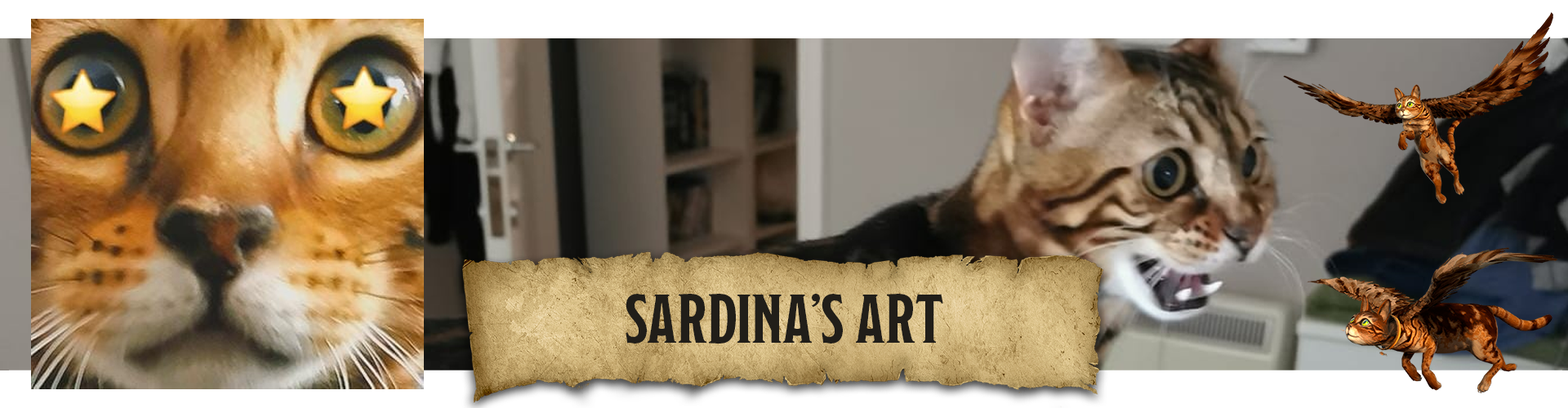 Sardina's real-life counterpart is a marbled Bengal whose life motto revolves around three big C’s: chin scritches, coziness, and chicken strips. Plenty of all that goes around, as her cat parents or one of the three siblings are always there. Being the most patient of the family, sweetness radiates around her. Don't piss her off though – you might need wings yourself when Sardina eventually gets zooming!