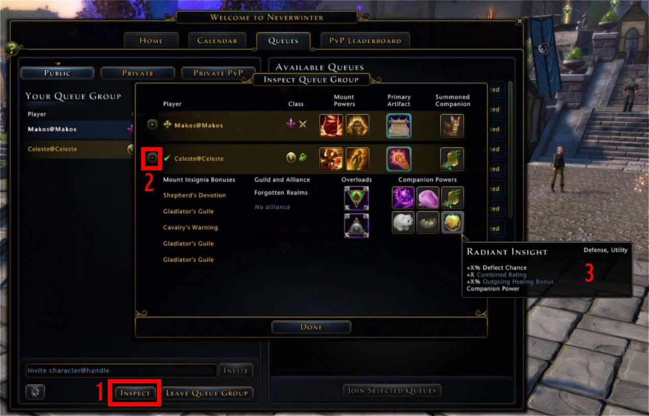 When you queue up and don't want any extra information, you can just start playing. The new menu we added can be found by clicking Inspect (1), giving you a popup window. From there you see the following information: