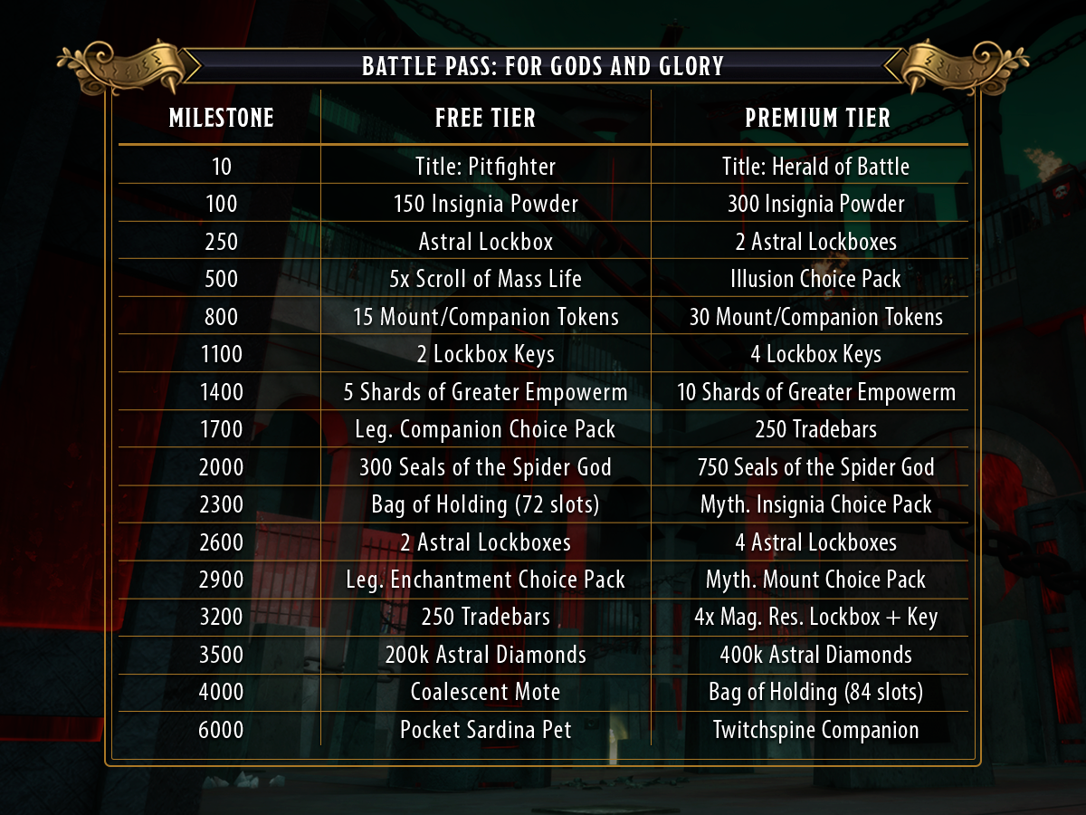 A longer Battle Pass consisting of 1 phase (For Gods and Glory: Deathmatch) with 16 milestones. You can collect 6,000 Battle Pass XP by doing Arena Activities, Random Dungeons, Trials, and Skirmishes.