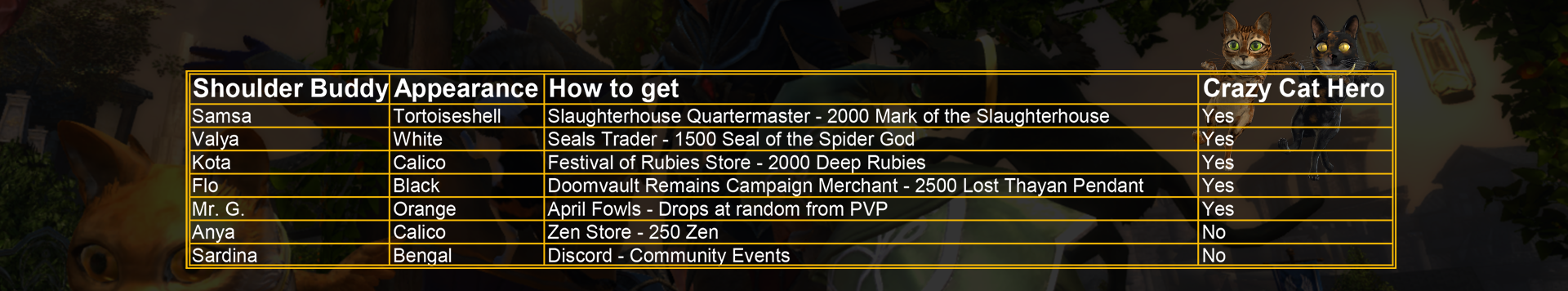 Want to be a Crazy Cat Hero? Then start collecting! Obtaining Samsa, Valya, Kota, Flo, and Mr. G will grant you the Crazy Cat Hero Achievement and Crazy Cat Hero Title.
