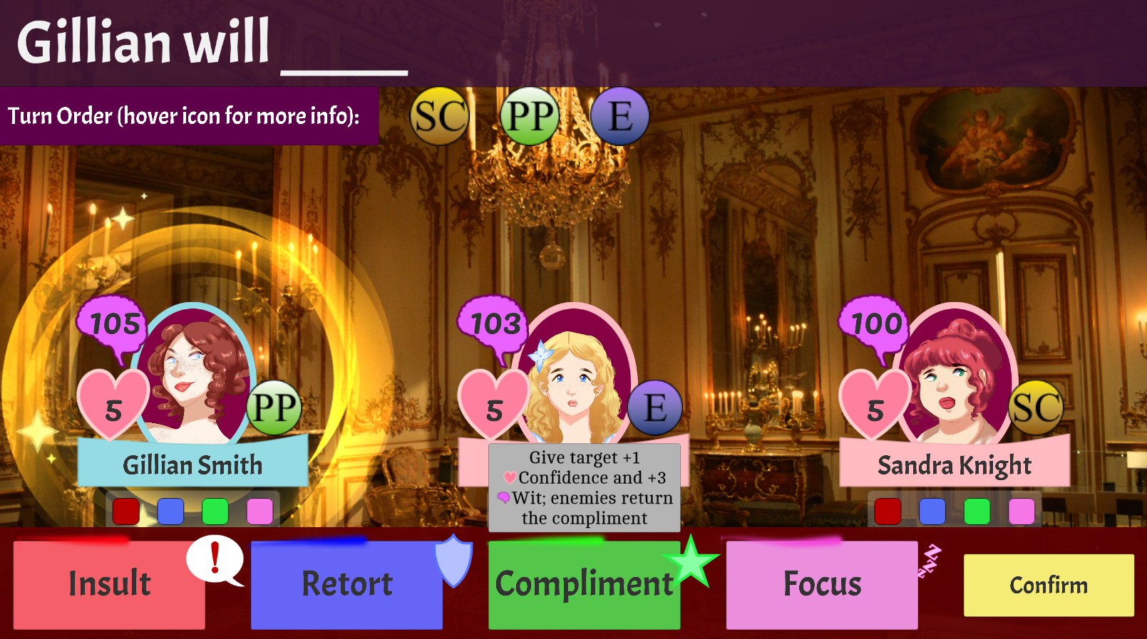 A whole swath of visual improvements have made their way into the game. Existing players might be a little disorientated by the fact that the top and bottom elements have switched places, but rest assured that the improvements are easy to get used to. There are now tooltips on actions when they are hovered, the input buttons are more at home on the bottom of the screen, defending and exaggeration bonuses are shown more clearly during insults, Wit and Confidence have accompanying icons whenever they are mentioned in tooltips, among many other changes.