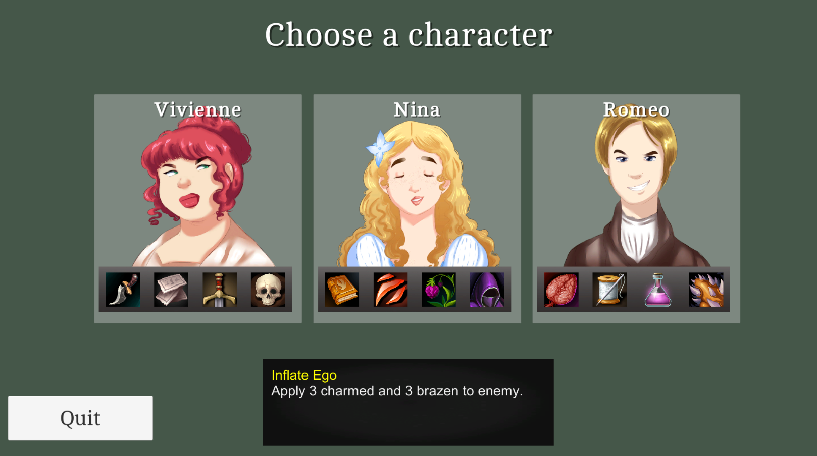 • Equippable items have been added to the game! These items provide passive bonuses to your characters throughout combat. Some of them also come with downsides, so you should be careful to make sure that you actually want the bonuses that the item provides before equipping it. Each combat will either offer abilities or items as a reward. Item rewards are rarer than ability rewards. You can see which rewards are items by hovering them.