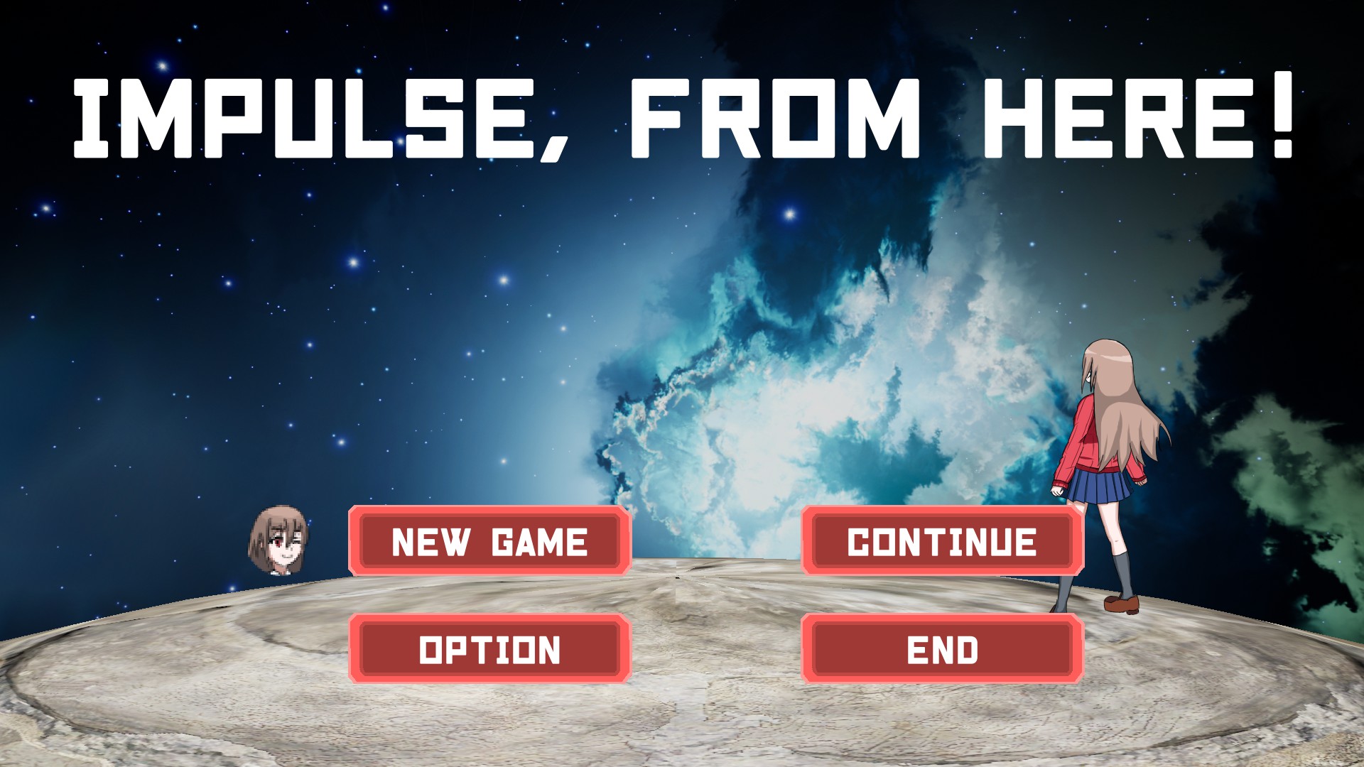 "Impulse, From Here" is a 2D action game featuring unique aerial controls that allow you to blow yourself up in explosions as you progress! The stages are highly challenging and offer multiple routes, so there's replayability! Look at the way the cute girl gets beaten up badly!