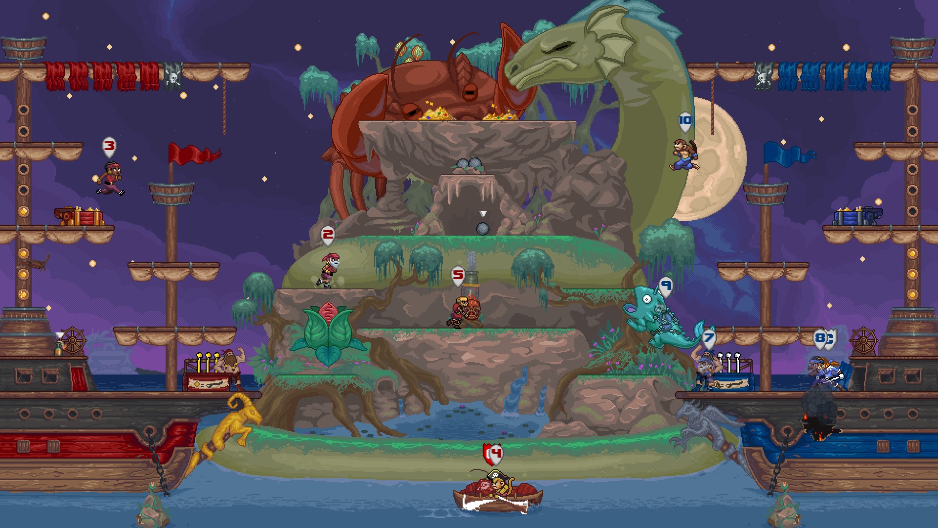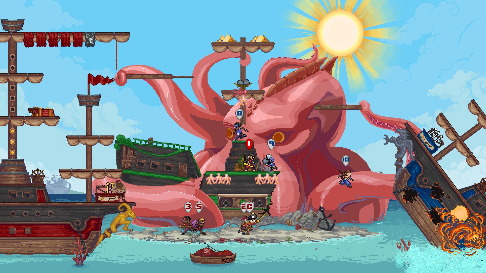 Chaotic Party Arr-cade Action for up to 12 players! Be the first to plunder all the treasure, sink the enemy ship, or defeat their captain. Featuring local & online play, crossplay, 18 stages, 30+ modify-arrs, and a single-player campaign!