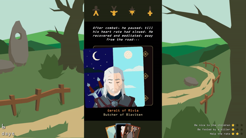 Adventure as Geralt through the ballads of Dandelion. Swipe right, swipe left, seek glory, find death! Will you hunt monsters, upset the locals, or run a hot bath? Compose an inspiring epic to claim immortality.