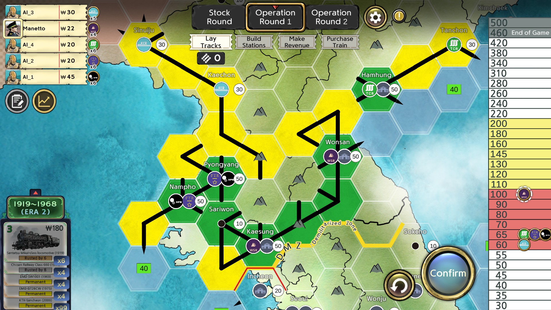 18Korea is an online multiplayer game for 2 to 5 players motivated by the beloved board game series '18xx'. In the 19~20 century Korean Peninsula, Make the best profit by running railroad companies and trading stocks.