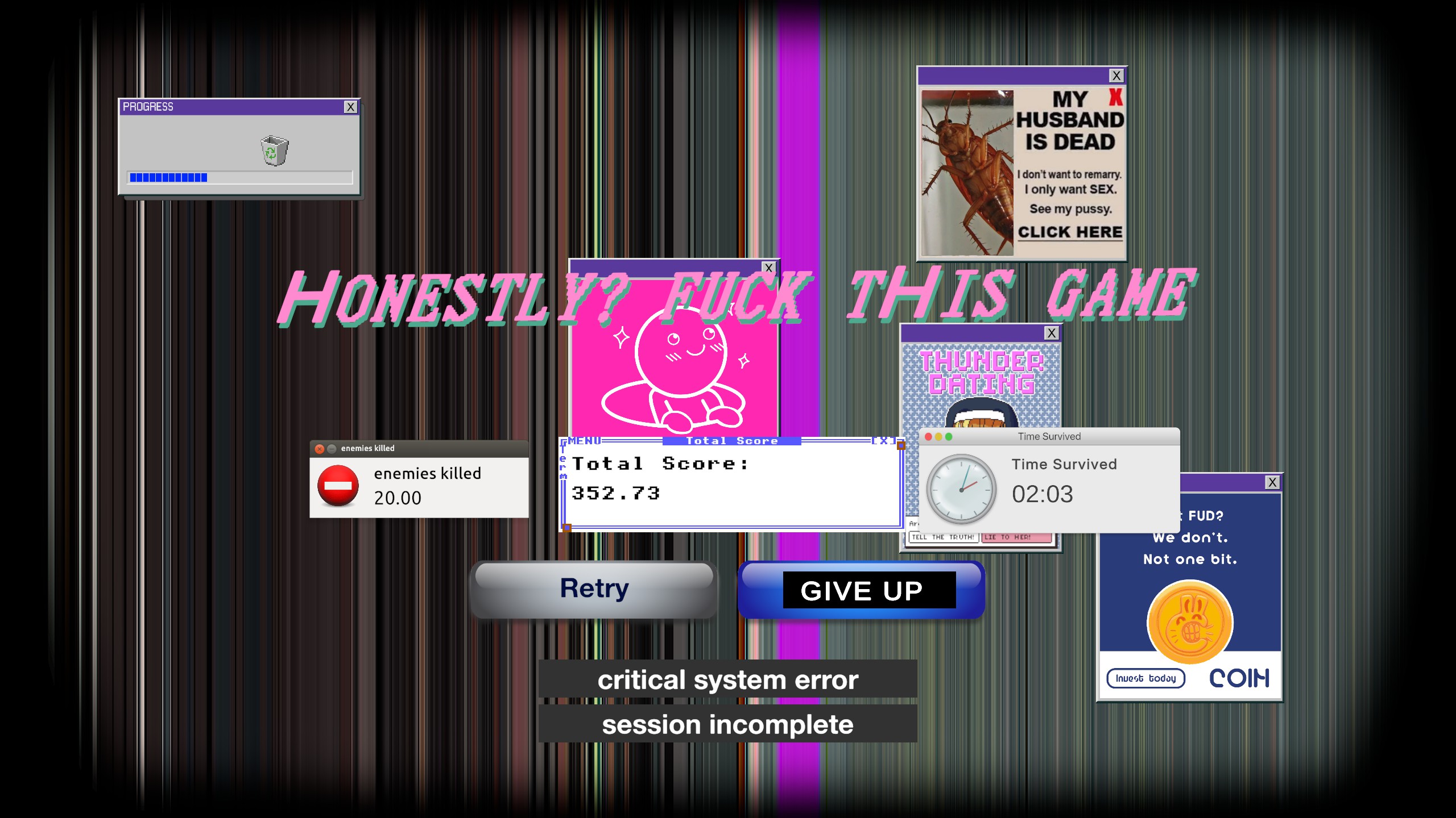 Splatter is a first-person fever dream where you blast constantly-adapting enemies into neon sprays of pulp and slime. Enter a digital mindscape constructed by four anonymous administrators. Can you survive? Can you remain sane? Can you remain yourself?