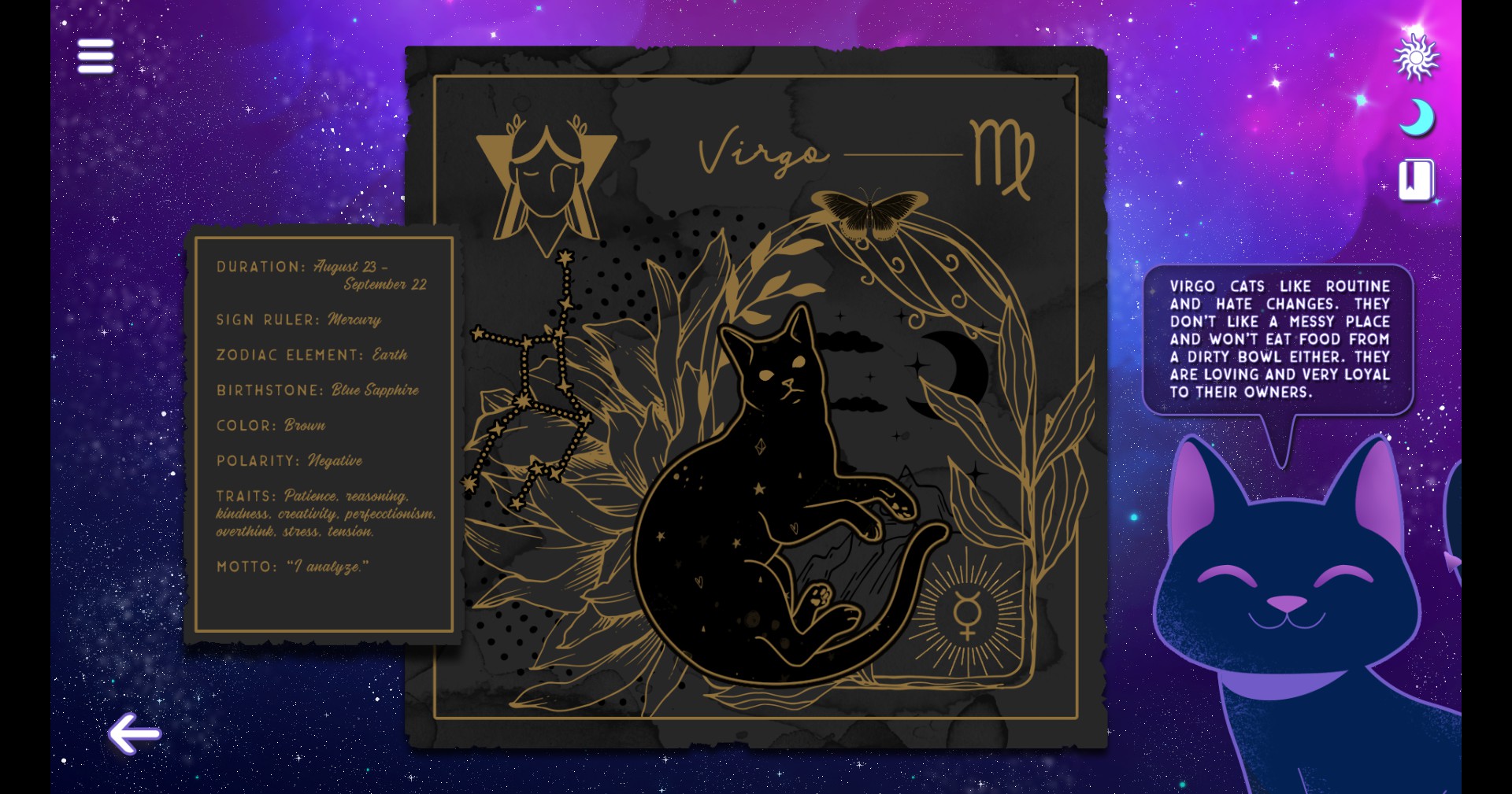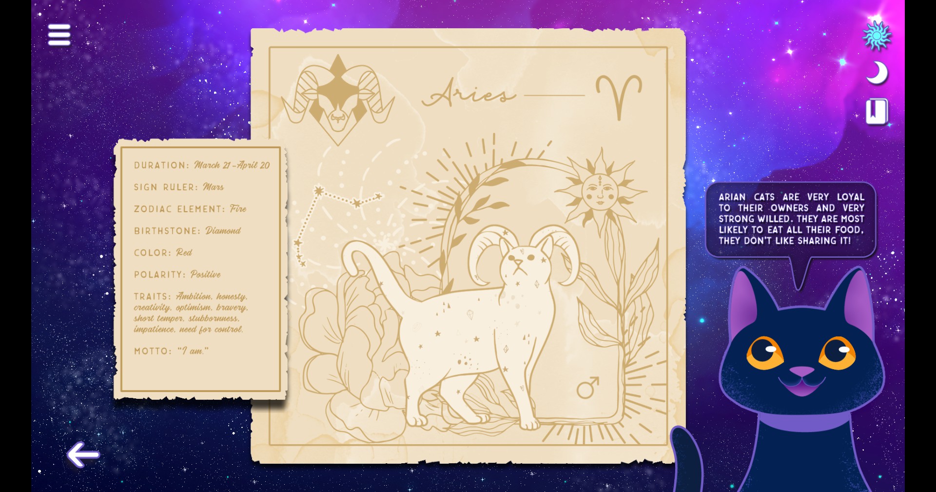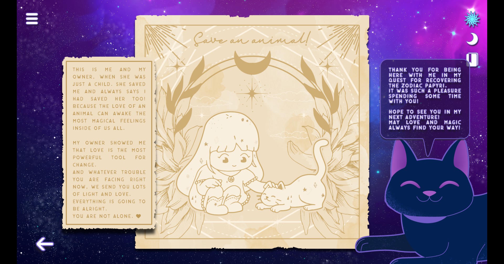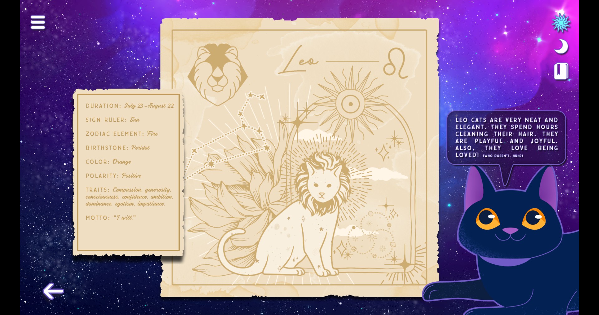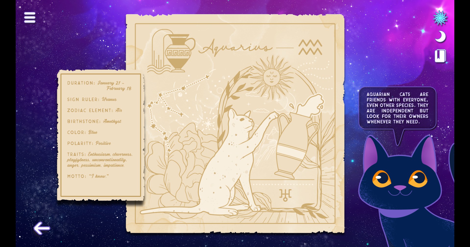 Follow cat Catherine on her journey for the lost astrology papyri and learn more about her job as a witch assistant for bringing good vibes into this Earth! Let Catherine guide you through the zodiac wheel, showing you about features of each solar sign. You can also learn about your cat's sign!