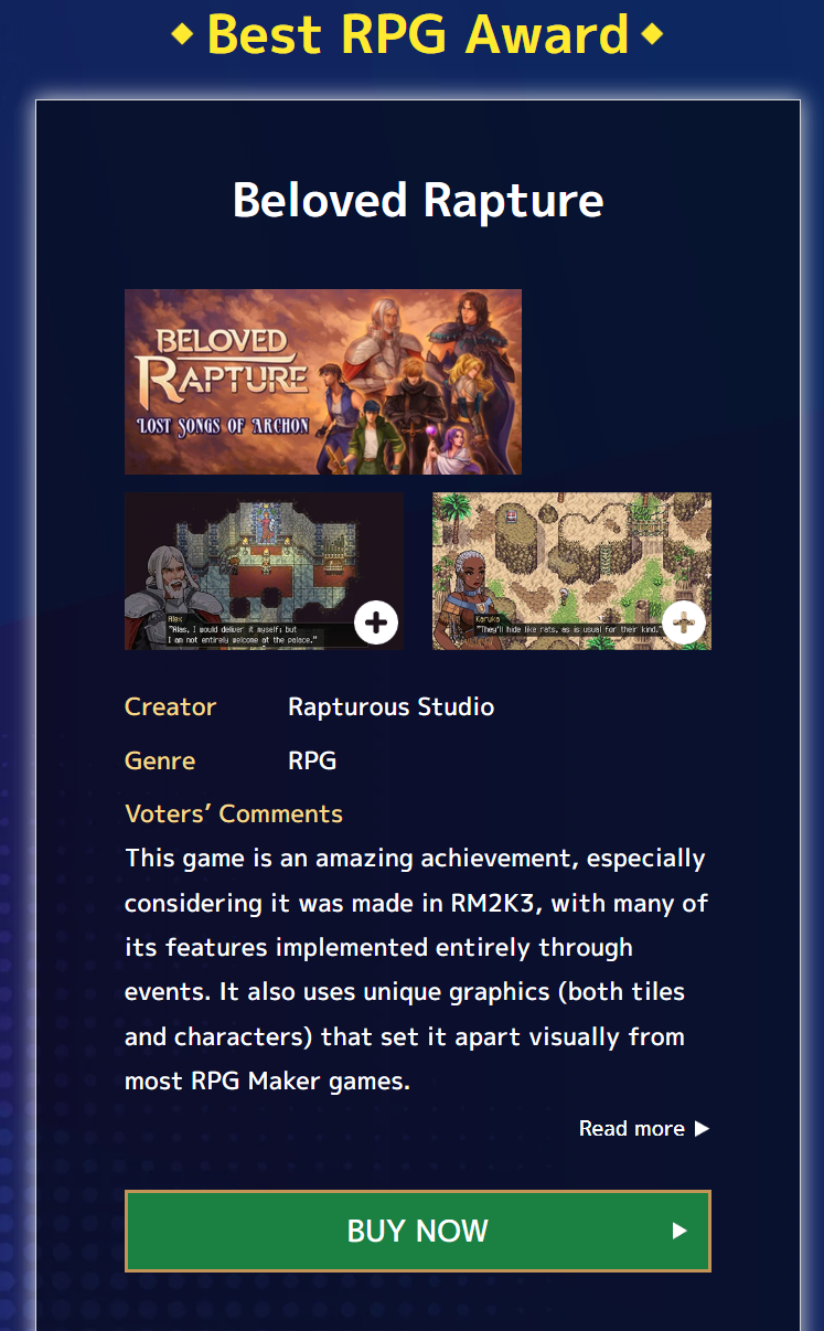Gotcha Gotcha Games, the current owner of RPG Maker software, informed me that Beloved Rapture won the "Best RPG" at their recent 2026 RPGMaker Awards