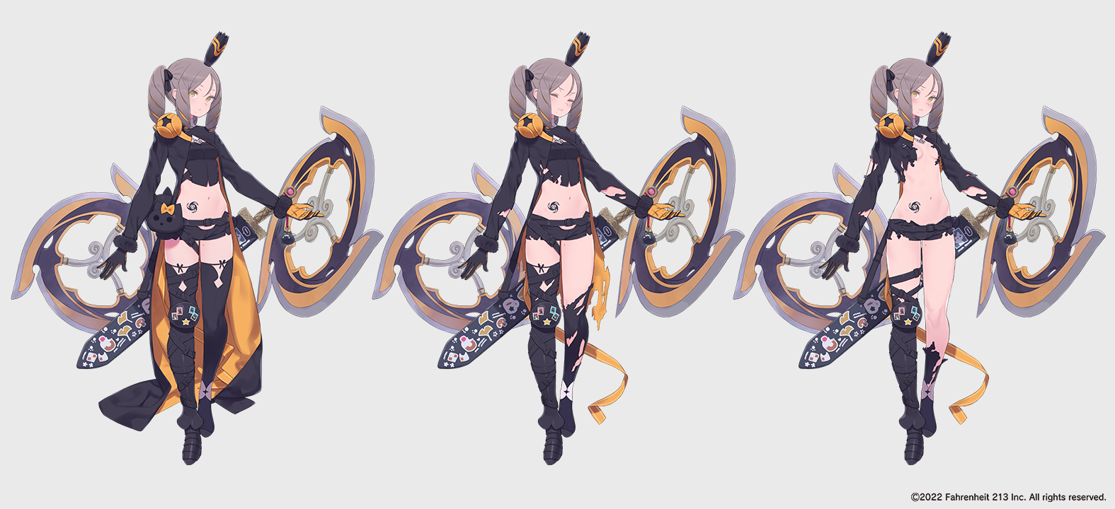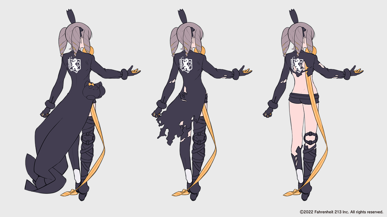 The character is designed not only from the front, but also from the back. In TSURUGIHIME, outfits gradually become damaged as the character takes hits, so details such as how the clothing tears from behind are carefully planned at this stage.