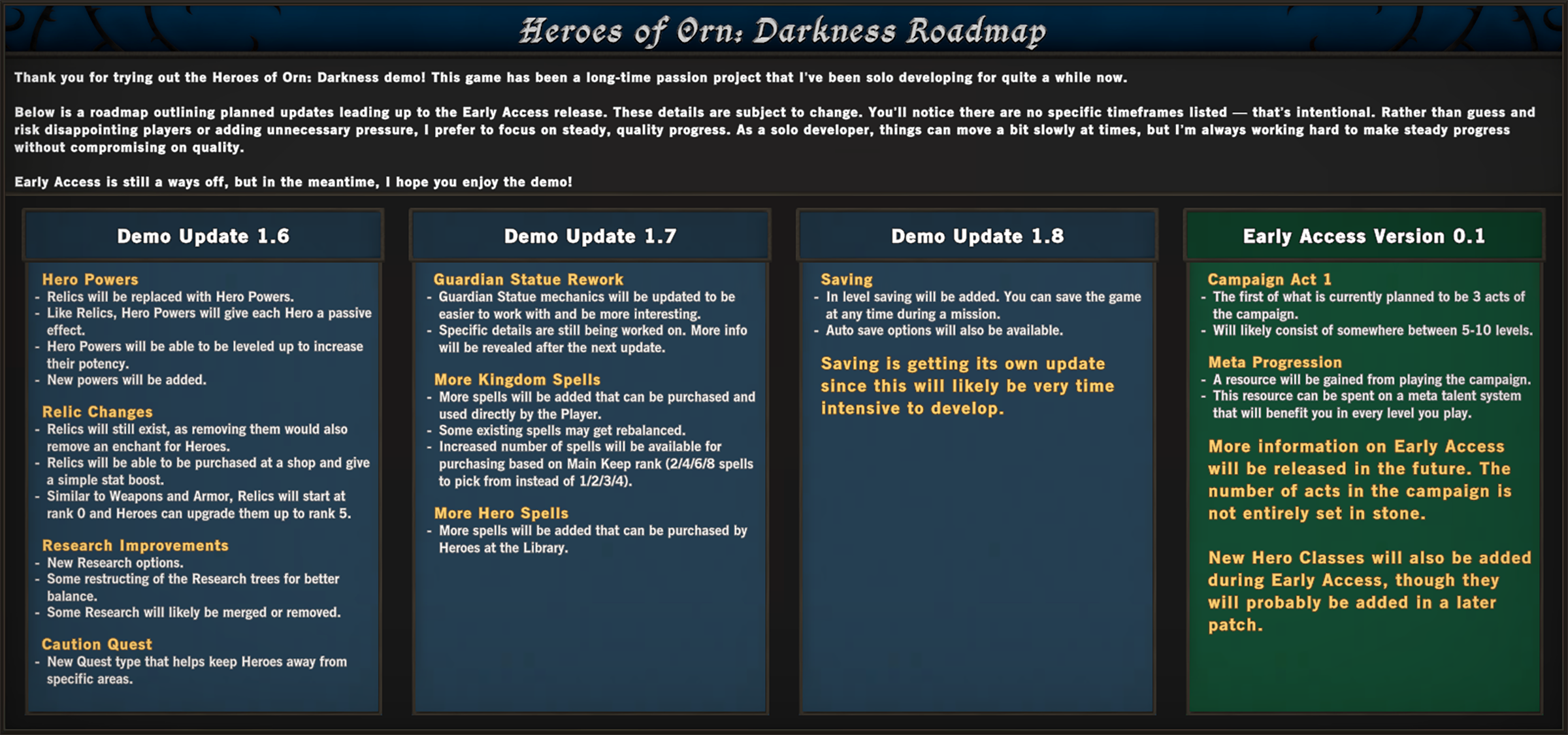 The Roadmap focuses more on big picture stuff, but balance changes, bug fixes, and other improvements will also be included in updates. As mentioned in the Roadmap, these details are subject to change in the future.