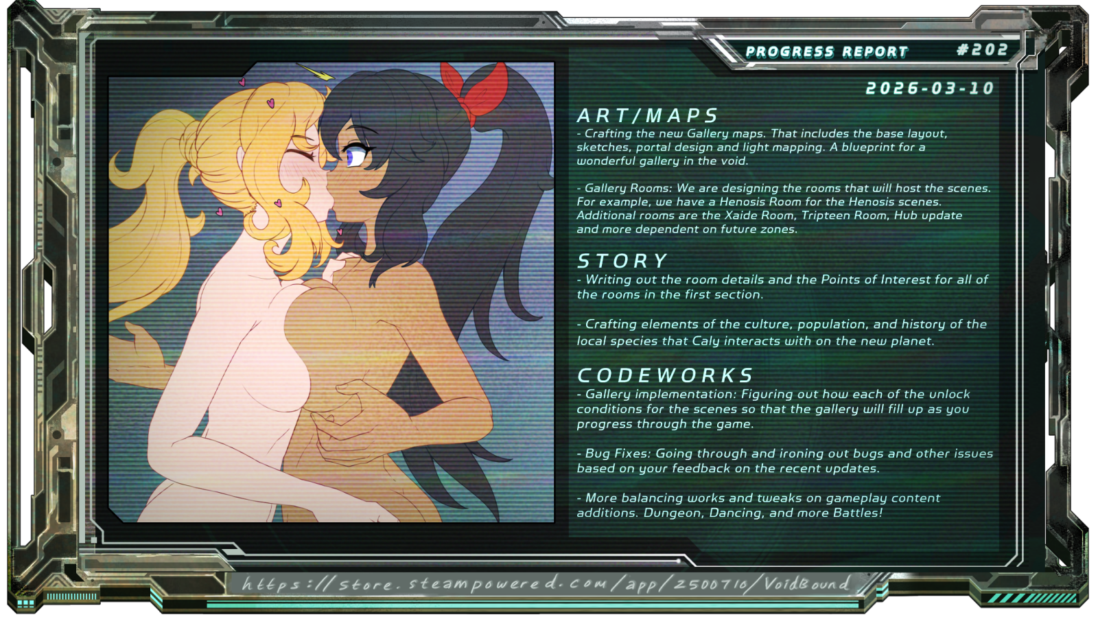 VoidBound is a sci-fi ero tactics RPG where you play as an engineer on a mission to free the Earth after it’s caught in the crossfire of an intergalactic alien war.