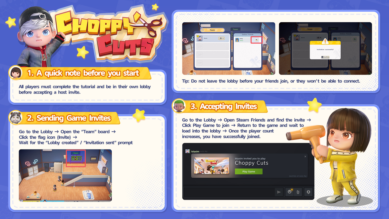 Welcome to Choppy Cuts! Grab your friends and go wild at this co-op snipping party. Efficiency is the key in this salon, so toss those tools, throw those customers, and do what you must to hit that goal!