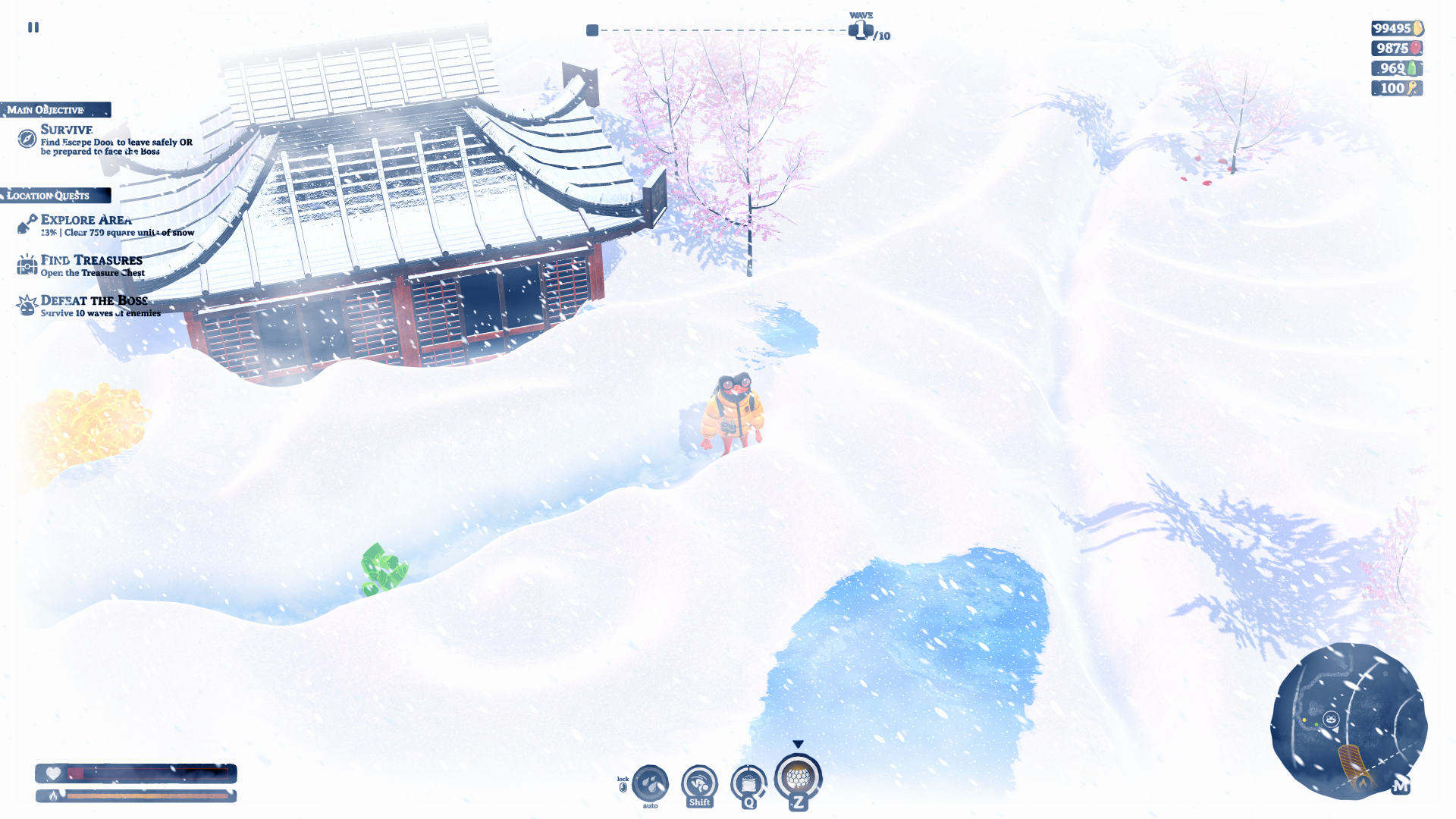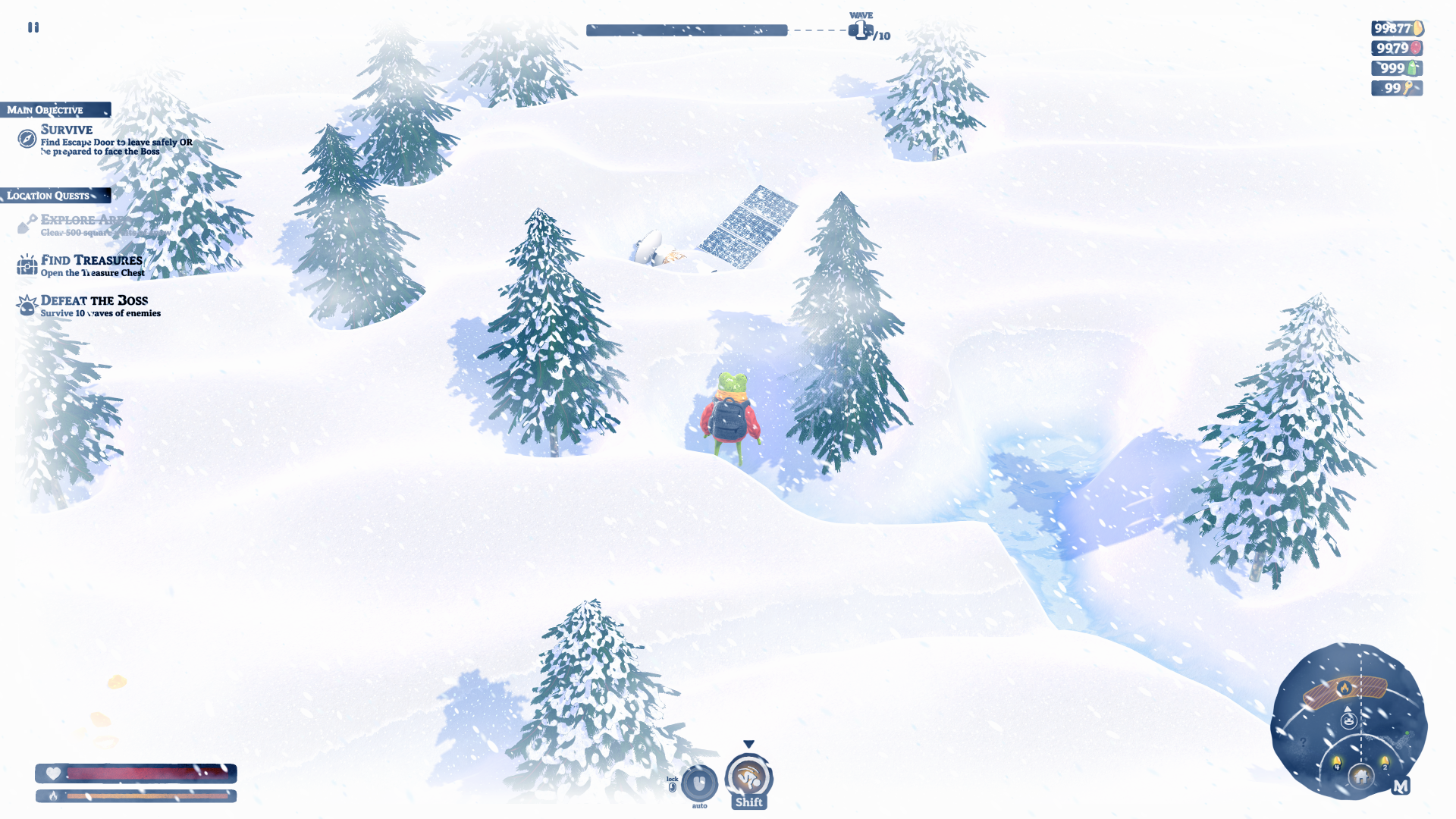 A survival roguelike where a frog digs through freezing snow, uncovers treasures, unlocks upgrades, and battles mystical creatures. Find the escape door — or defeat the final boss to survive.