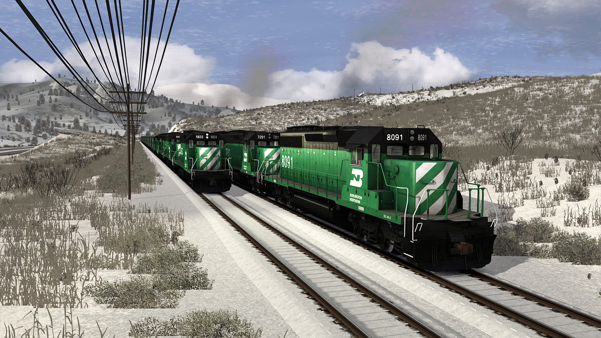 A pair of Burlington Northern General Electric U25B “U-Boats” work a Butte-bound local on the line to Three Forks. With the upcoming Burlington Northern Scenario Pack 01, you will handle heavy tonnage, priority intermodal traffic, locals, and switching duties.