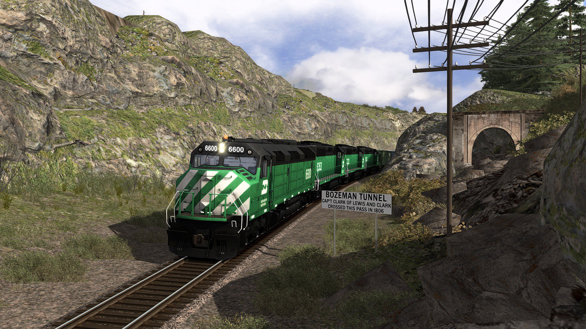 With Burlington Northern Scenario Pack 01, you will climb aboard and take the controls of eight types of Burlington Northern Electro-Motive and General Electric diesels. In a two-part end-to-end run of the scenic Bozeman Pass route, Burlington Northern EMD F45 6600 leads a westbound grain train at the summit of the pass.