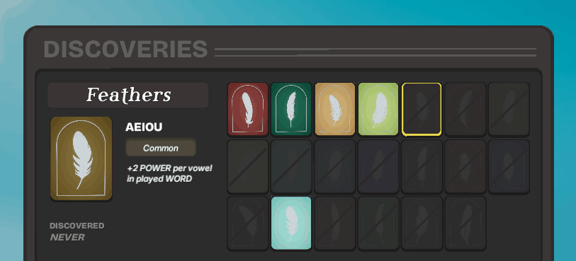 A word game about migrating birds - inspired by Wordle and Balatro. Play cards, build your deck, trigger combos and guide your flock. From John August (Corpse Bride) and Corey Martin (Bonfire Peaks).
