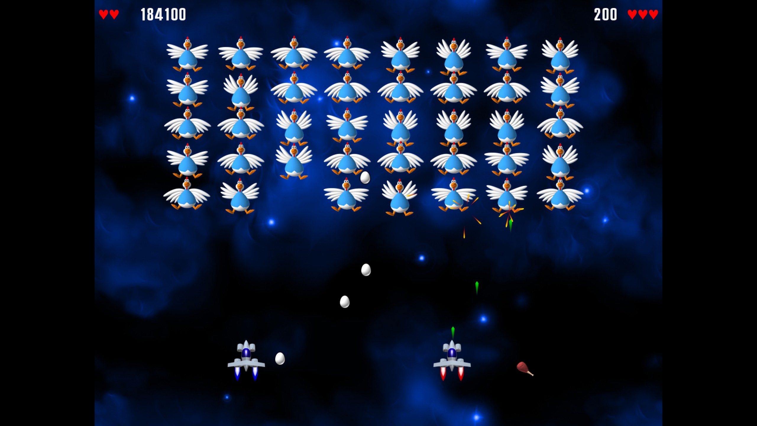 Save Earth from an invasion of intergalactic chickens! Finger-blistering arcade shooting action for one or two players.