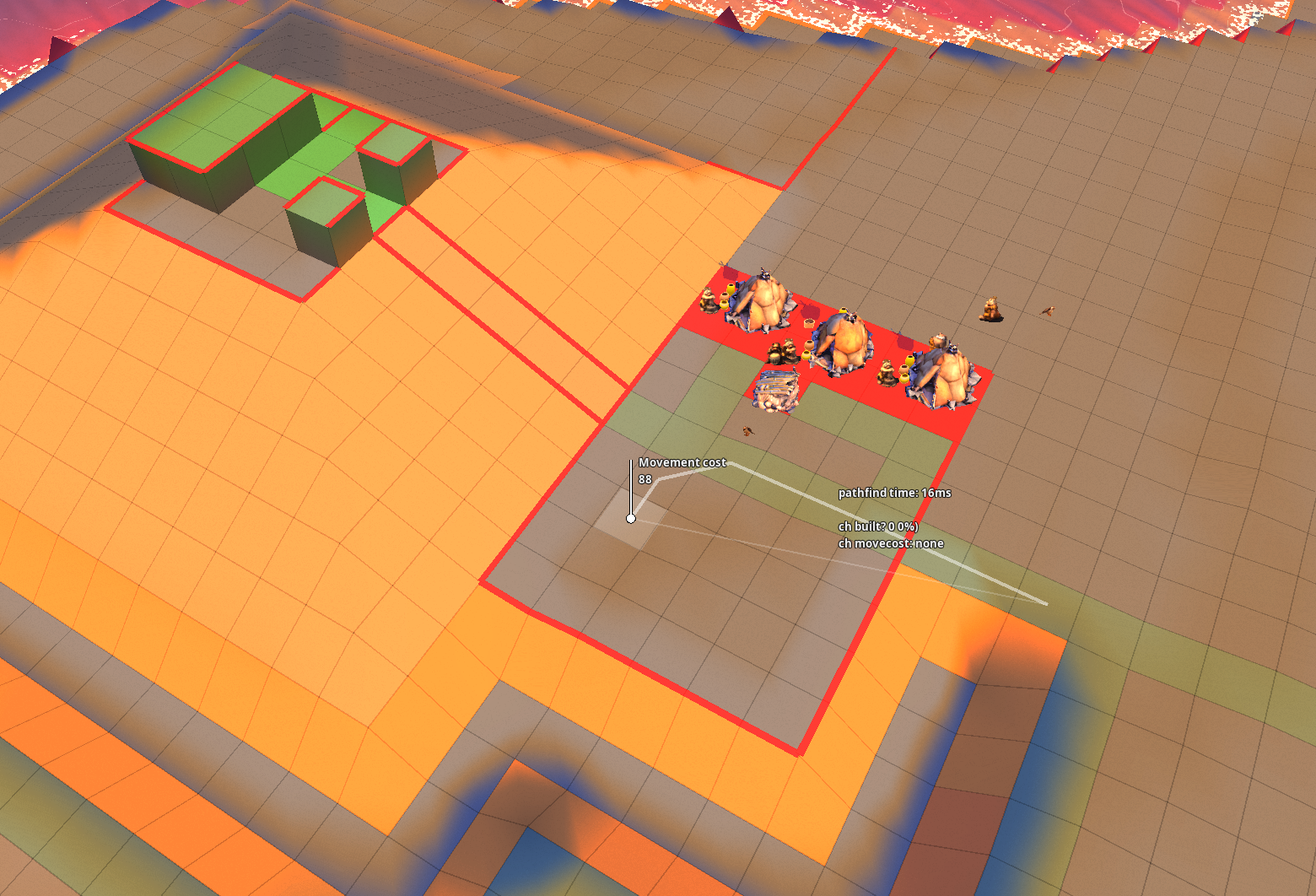 I've also added to the "movement cost" display layer the ability to test and display paths, which will give you as a player an idea of what the default path between 2 points in your fortifications would be, helping you design and test your defenses.