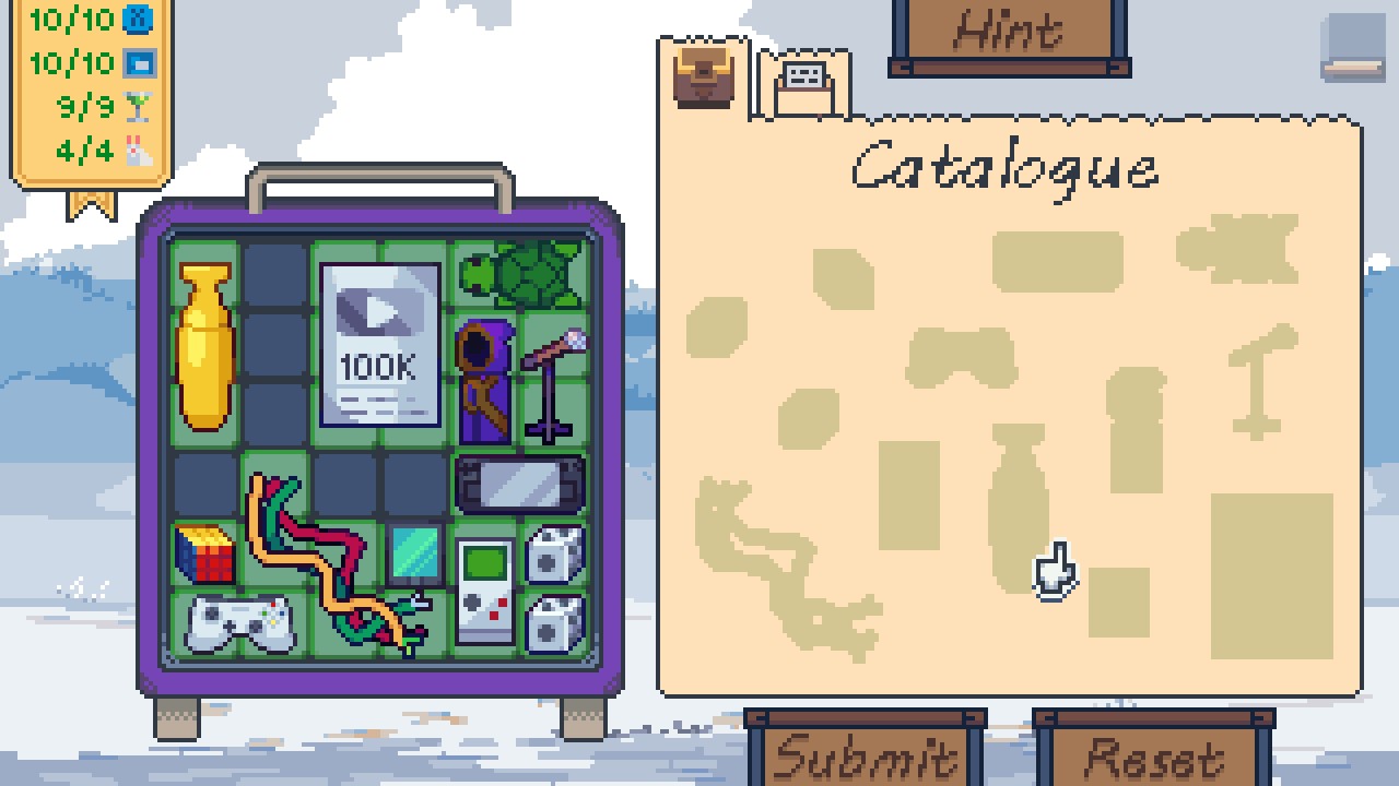 Outpacked is a cosy logic puzzle game about packing items into luggage while satisfying various logical constraints. Meltable items cannot be adjacent to hot items, and fragile items must be adjacent to only soft items, and so on. Featuring 61 levels, plus a level editor and Steam Workshop support!