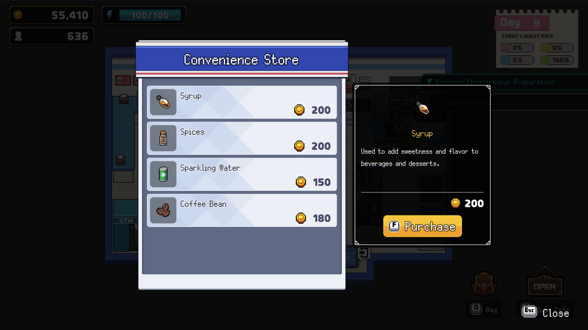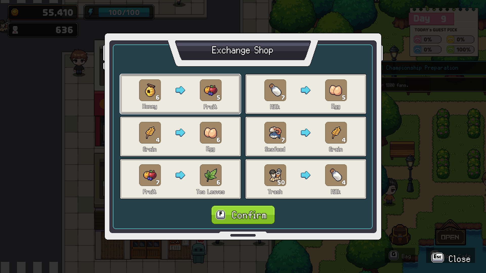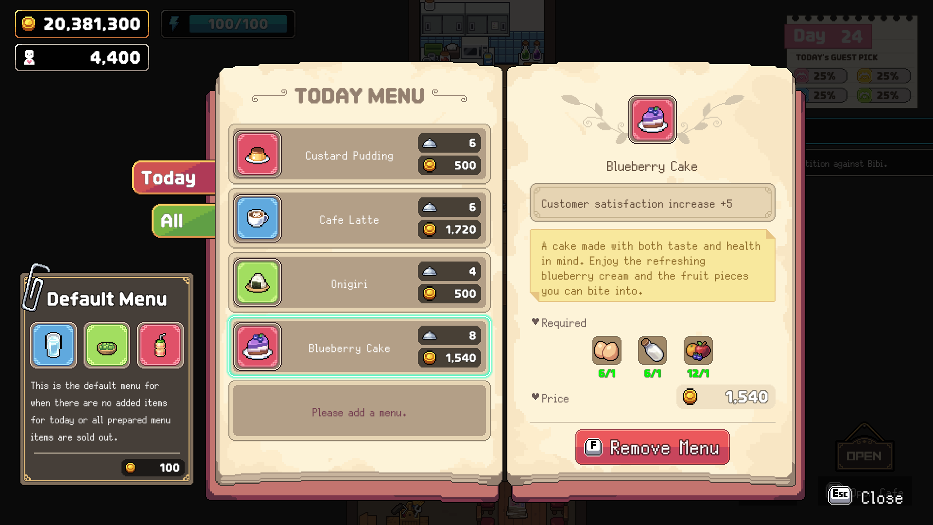 You can design your cafe’s menu as you like, but every dish needs specific ingredients! So, how do you get them? Easy! You can get them through "Farmer’s Requests" or by visiting shops like the "Convenience Store."