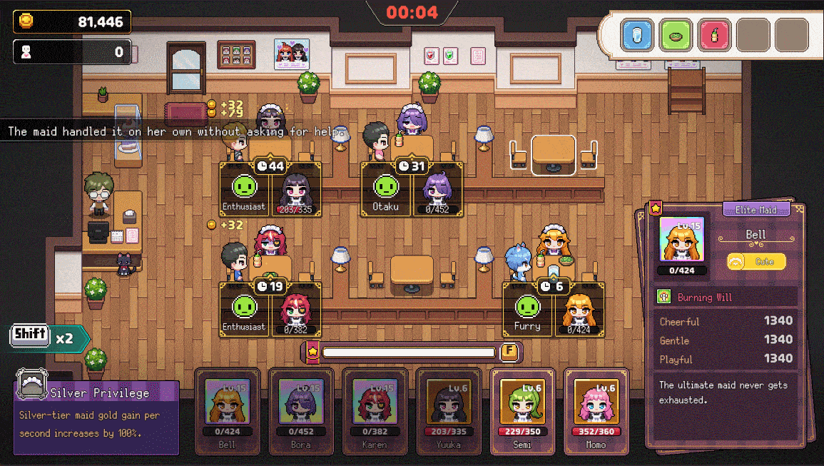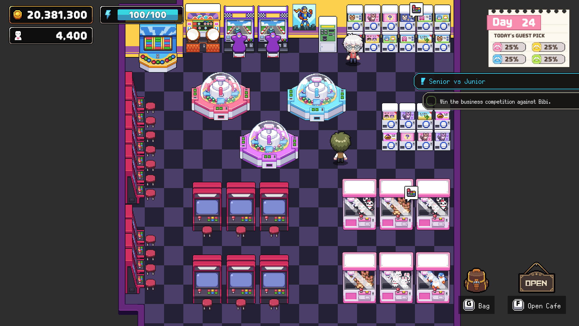At the Arcade, try your luck at the Claw Machine and Gacha! The dolls you win can be used to decorate your cafe, and if you complete your Gacha collection, a very special reward is waiting for you!
