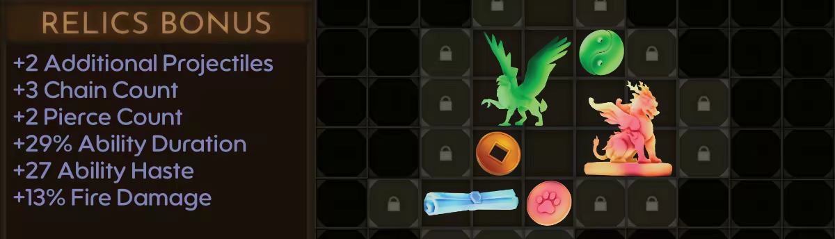 Each Relic grants stats: from global additional projectiles, to increased pierce, extra chain count, bonus damage, and more.