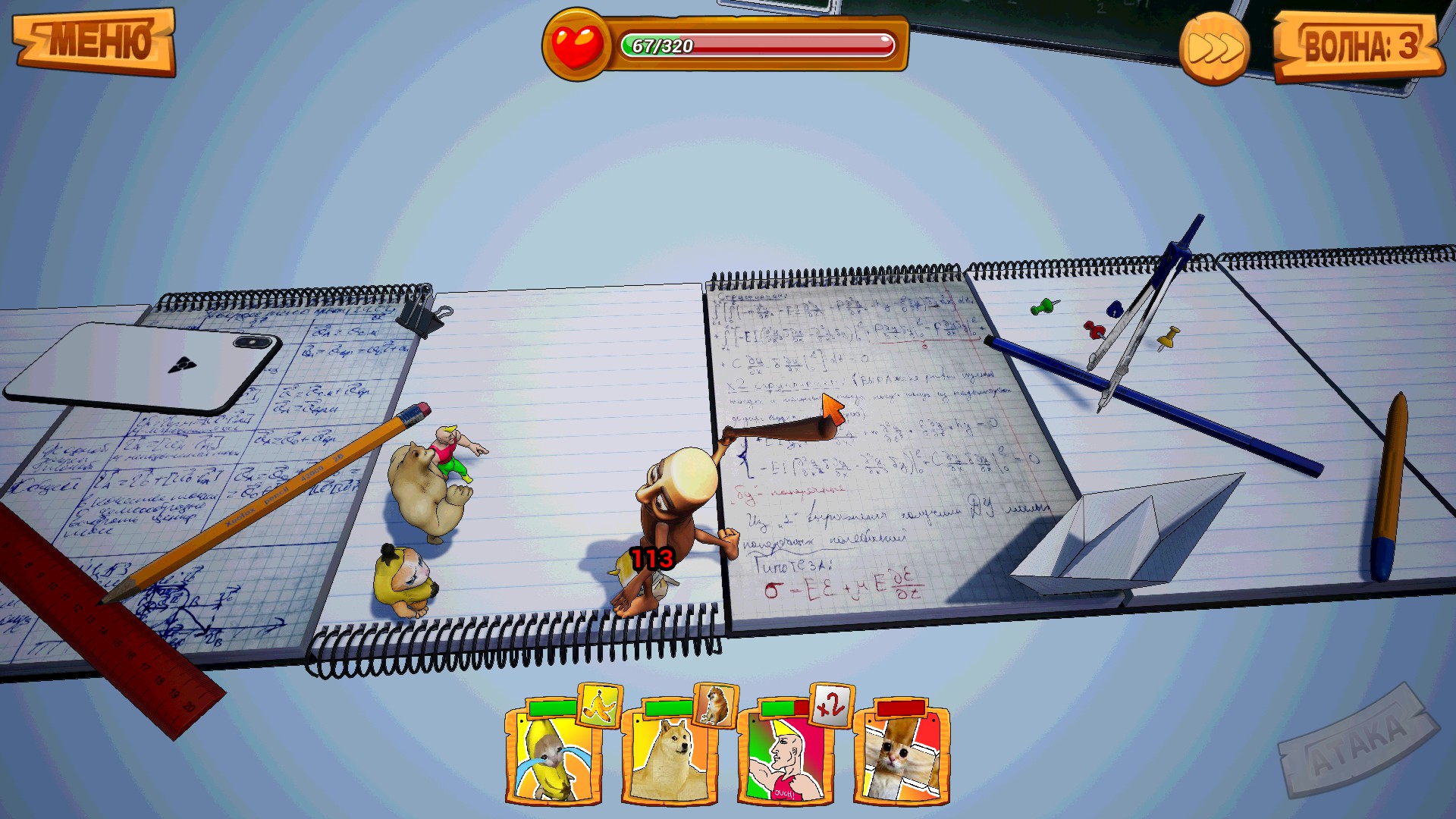 Lead an army of the internet's most recognizable memes in crazy turn-based tactics! Assemble a squad of Slappy, Doge, Gigachade and Banana Cat to clear waves of enemies, upgrade their abilities and reach the final boss of memology. It's time to find out whose meme is stronger!