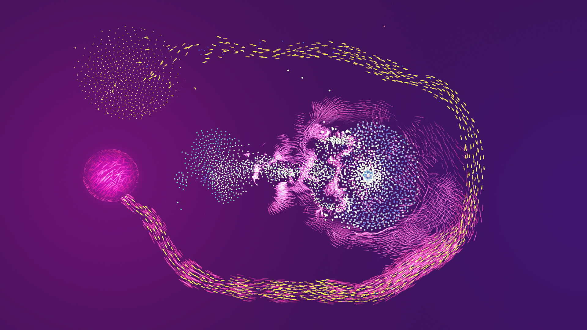 The simulation runs thousands of independent creatures in real time. Each responds to your actions and to each other, so no two solutions unfold the same way.