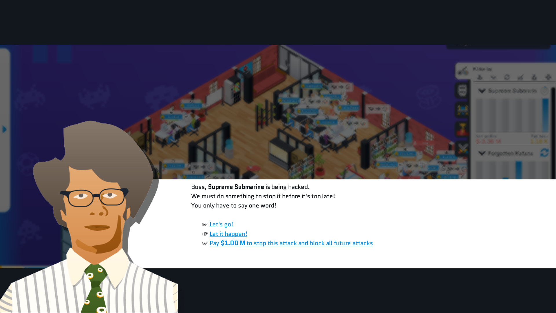 First up: an improvement to the in-game DDoS attack. You now have the option to pay $1,000,000 to never have to do that mini-game again. I figured that's the right price, not too cheap, not too steep. On lower difficulties, $1,000,000 comes fairly easily, but it's more of a real challenge on harder ones. I can always adjust it down the line if needed.