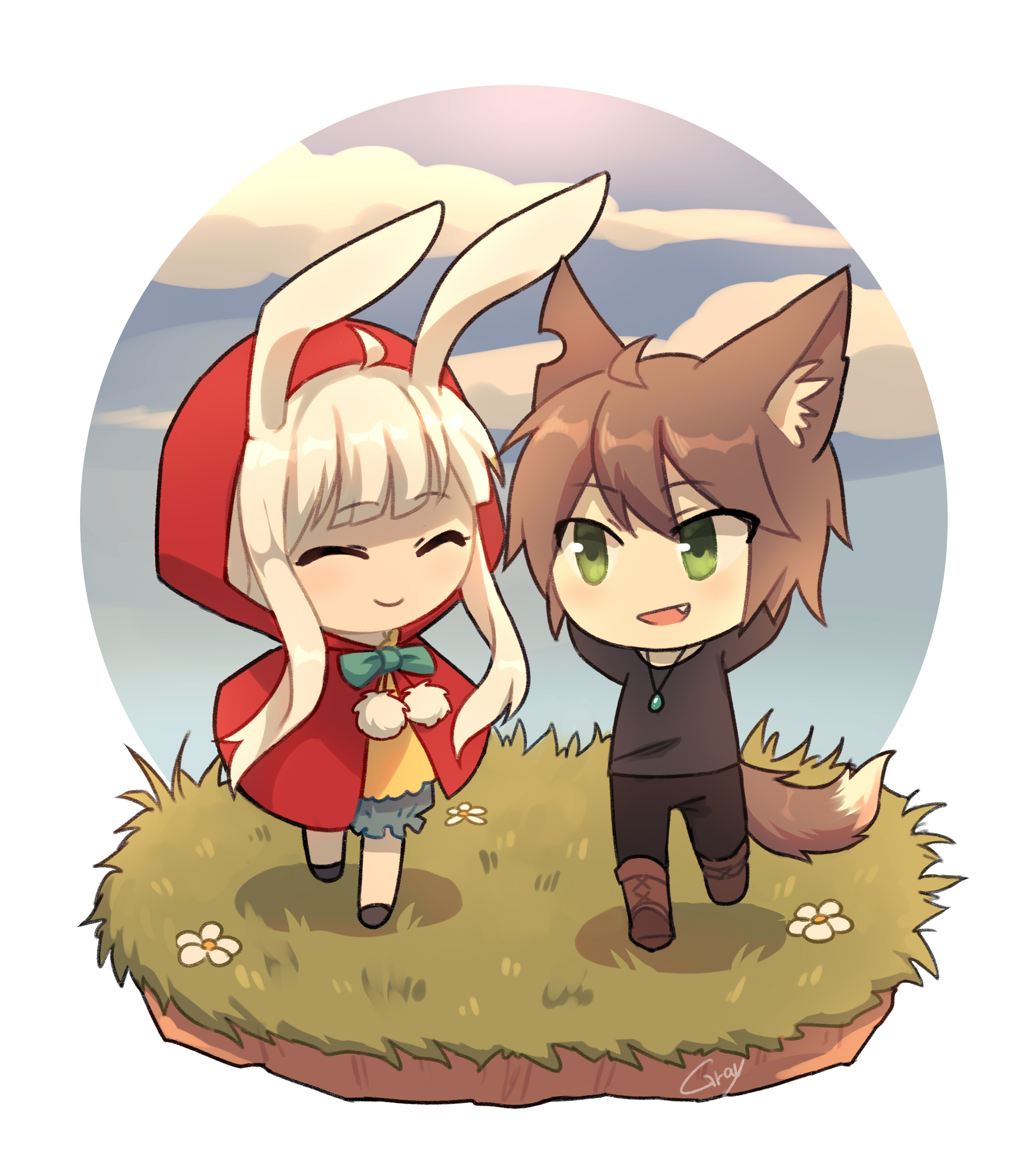 Our hero, an injured wolf boy, encountered a rabbit in red picking up flowers on his way escaping from a forest. The kind rabbit girl invited the wolf boy to her grandma's house for a treatment, yet... Standing in front of the house, the wolf boy felt... somehow, uneasy.