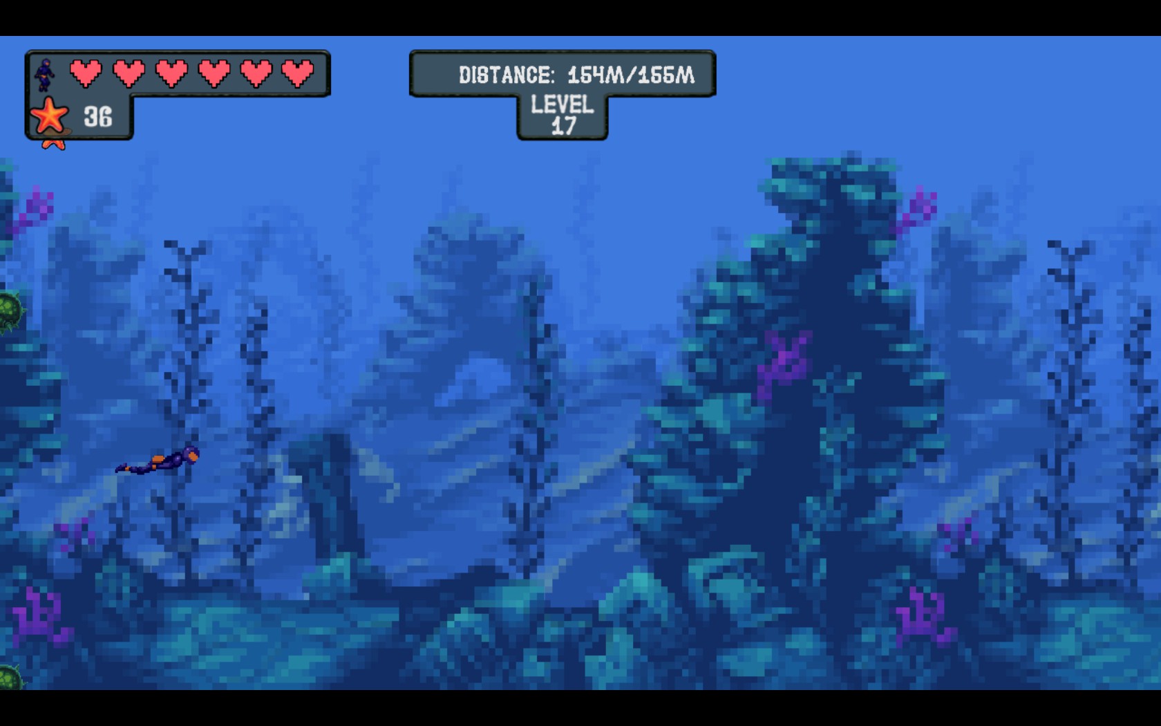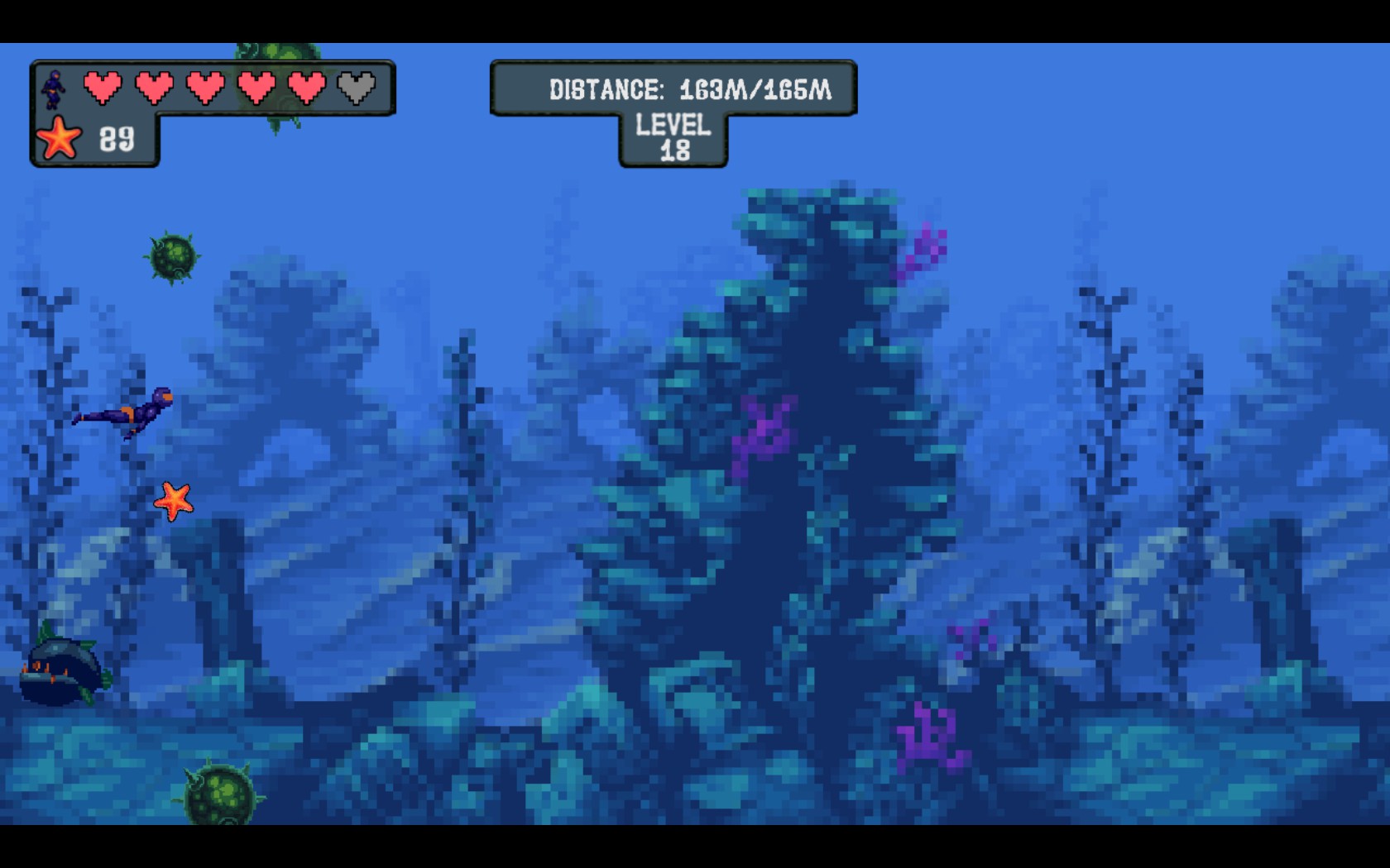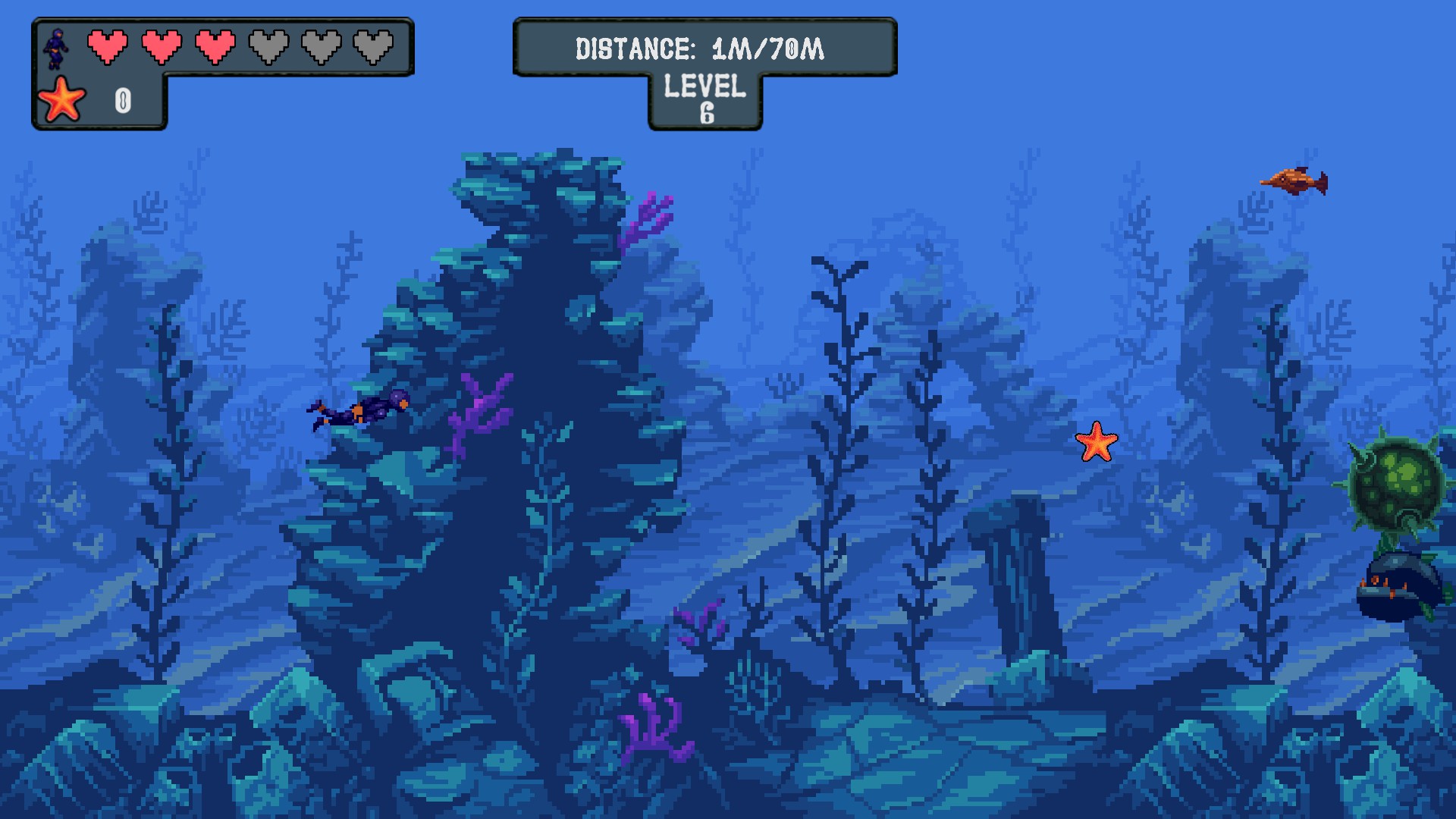 Your goal is to protect our main character from underwater bombs and predators while he swim to a certain point.