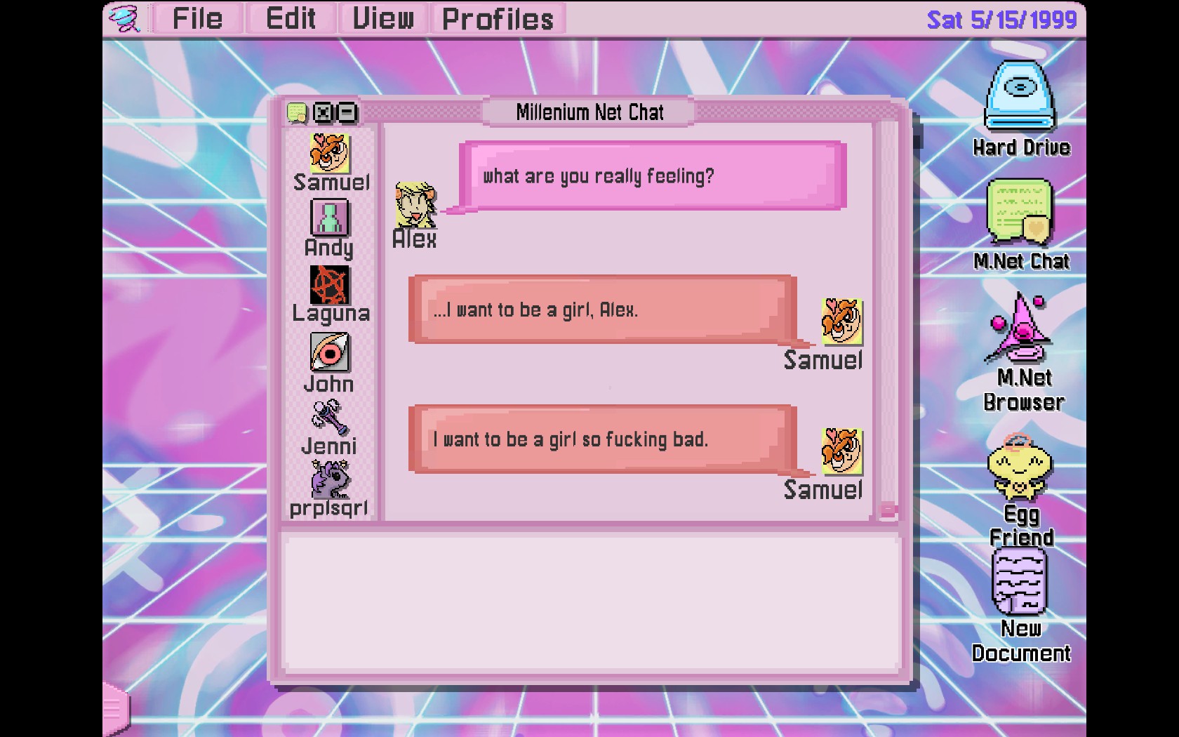 An adventure game about old computers, community, creativity, fandom, gender, and the internet. Alex Cole is a teenage trans girl in 1999 who has yet to figure herself out. She spends much of her free time on the internet, browsing a fan forum for her favorite magical girl show, and chatting with...