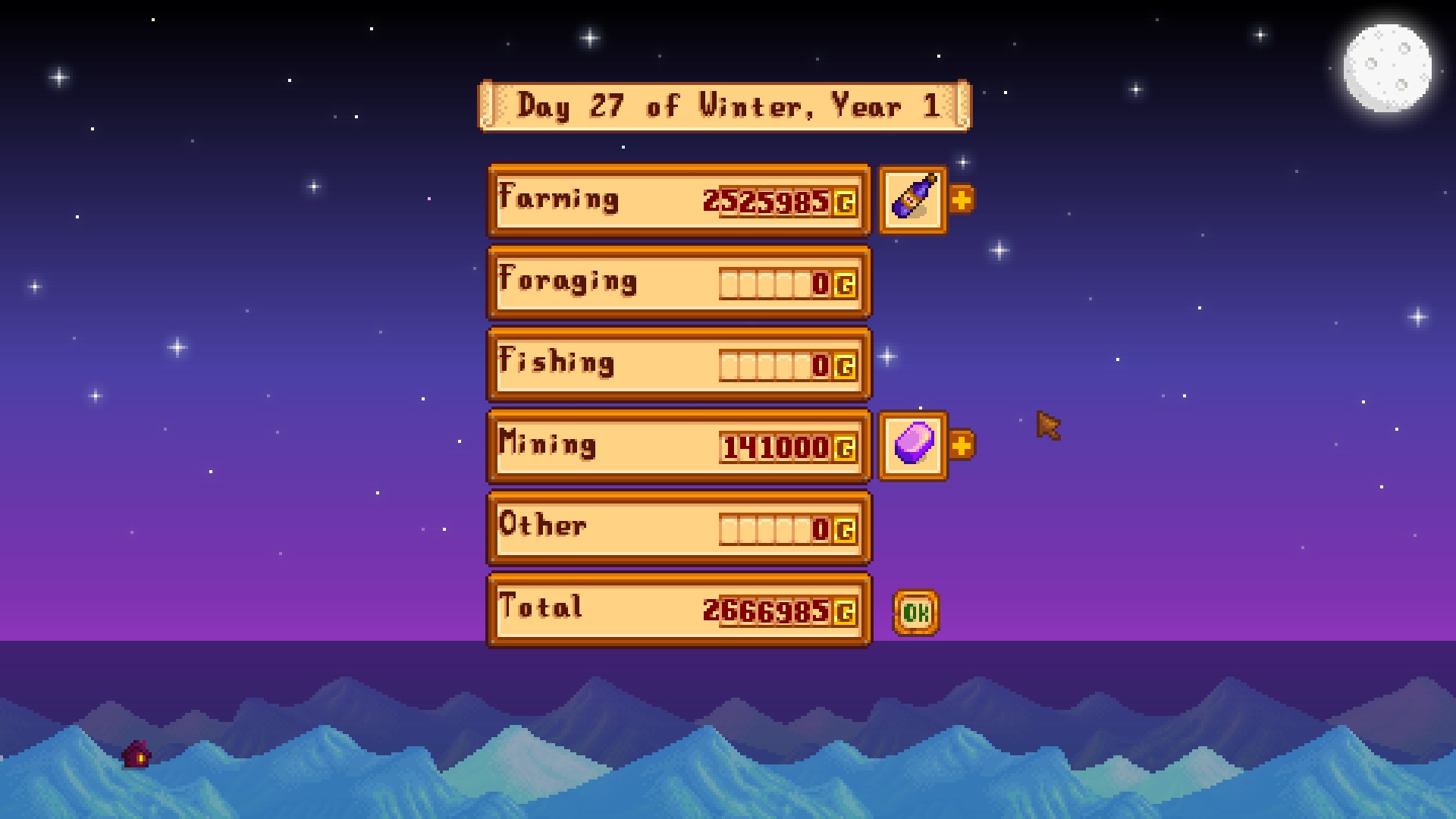 The last sale of winter making the total earnings in year 1 over 5 million. Yearly summary: Only 2 more artifacts to finish the museum collection, only 1 more fish to catch every fish in the game (forgot pufferfish ;-;). Only an apple & a truffle away from